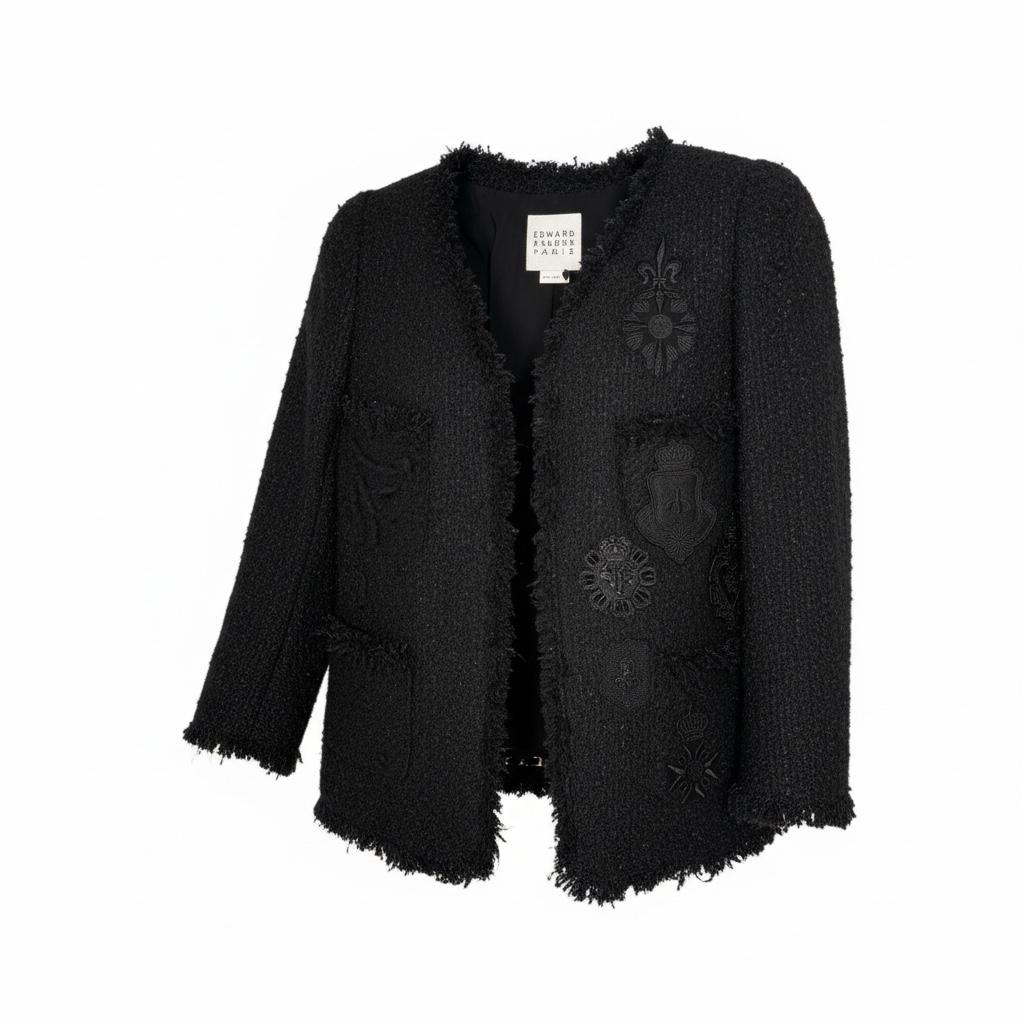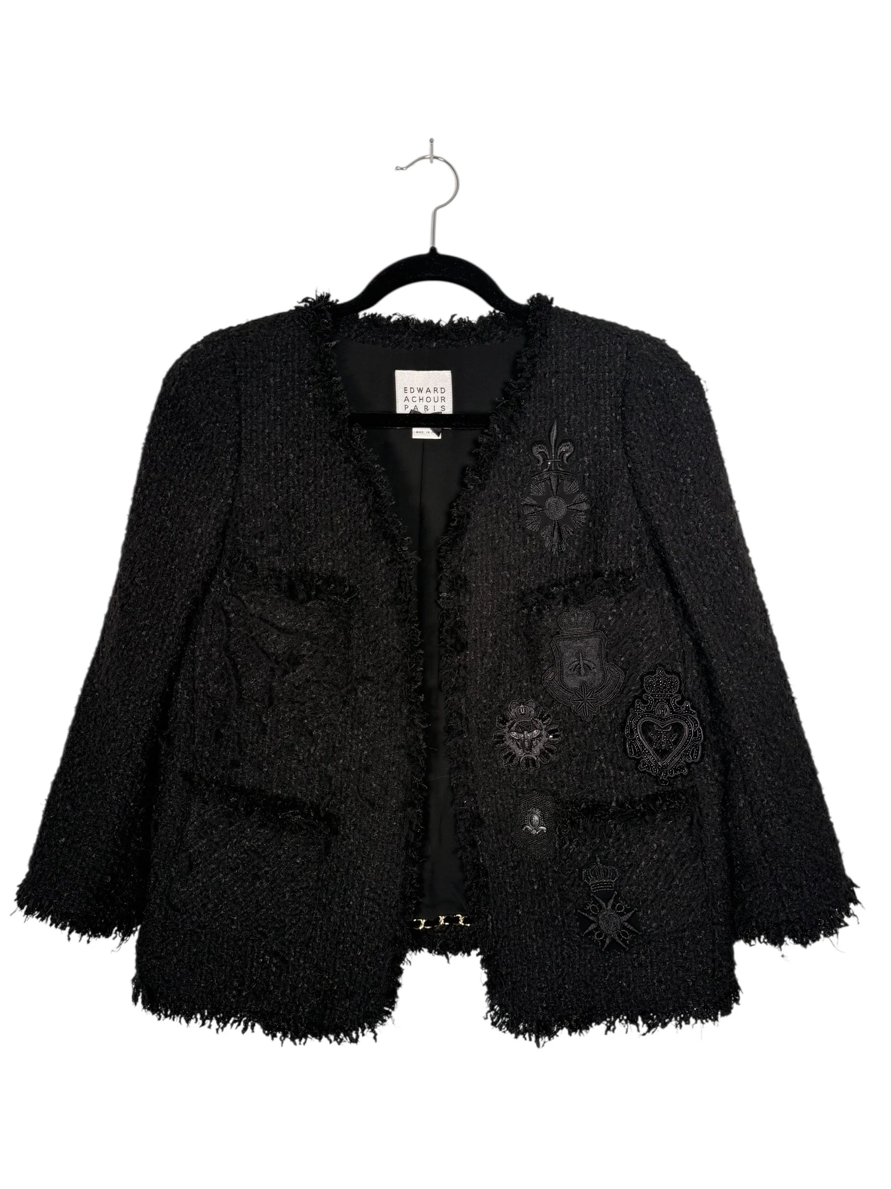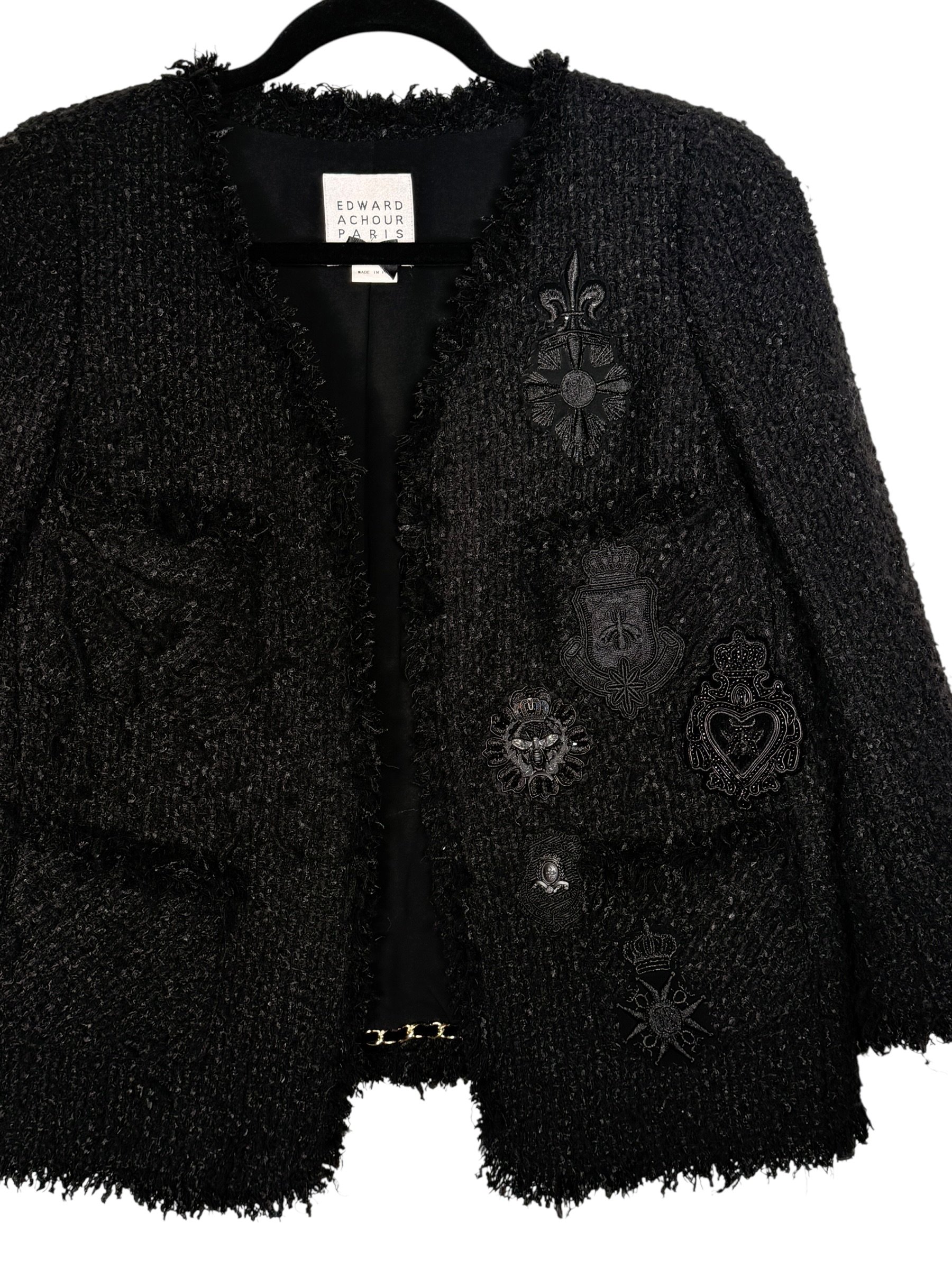 Edward Achour Paris jacket, black tweed jacket, embroidered jacket, fringe jacket, Parisian style, boutique designer, statement jacket, textured blazer, luxury resale