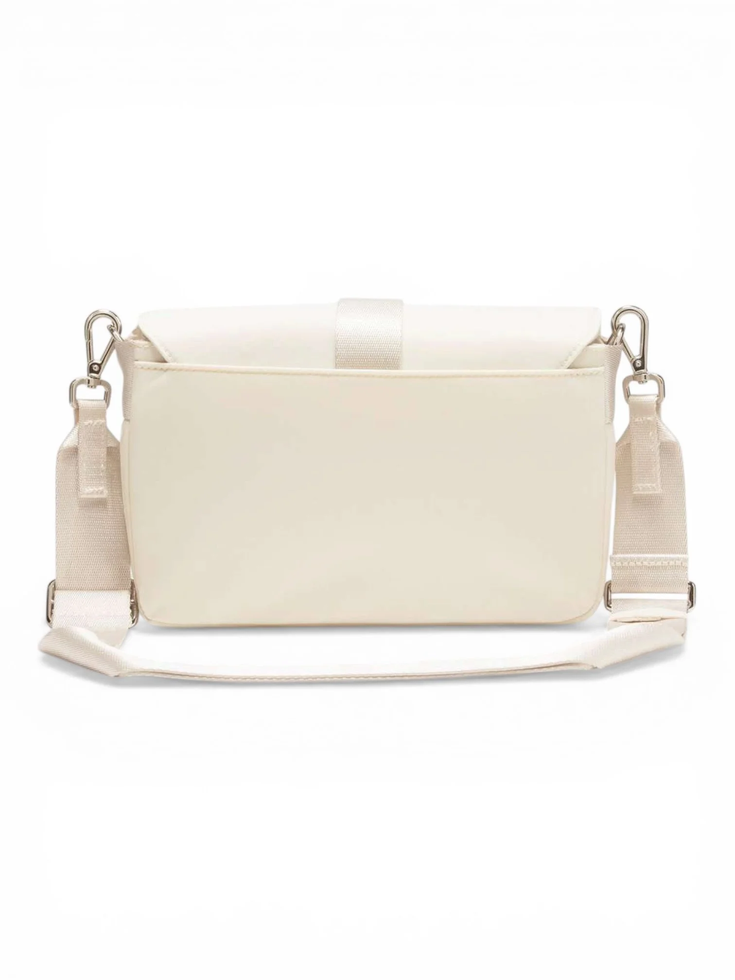 The front features two zippered exterior pockets with a center buckle closure strap, giving it that utility-meets-elevated look that is trending hard right now. Inside you get a main compartment with interior zippered and slot pockets, plus a back slip pocket. The adjustable crossbody strap detaches fully so you can swap it or style it differently.