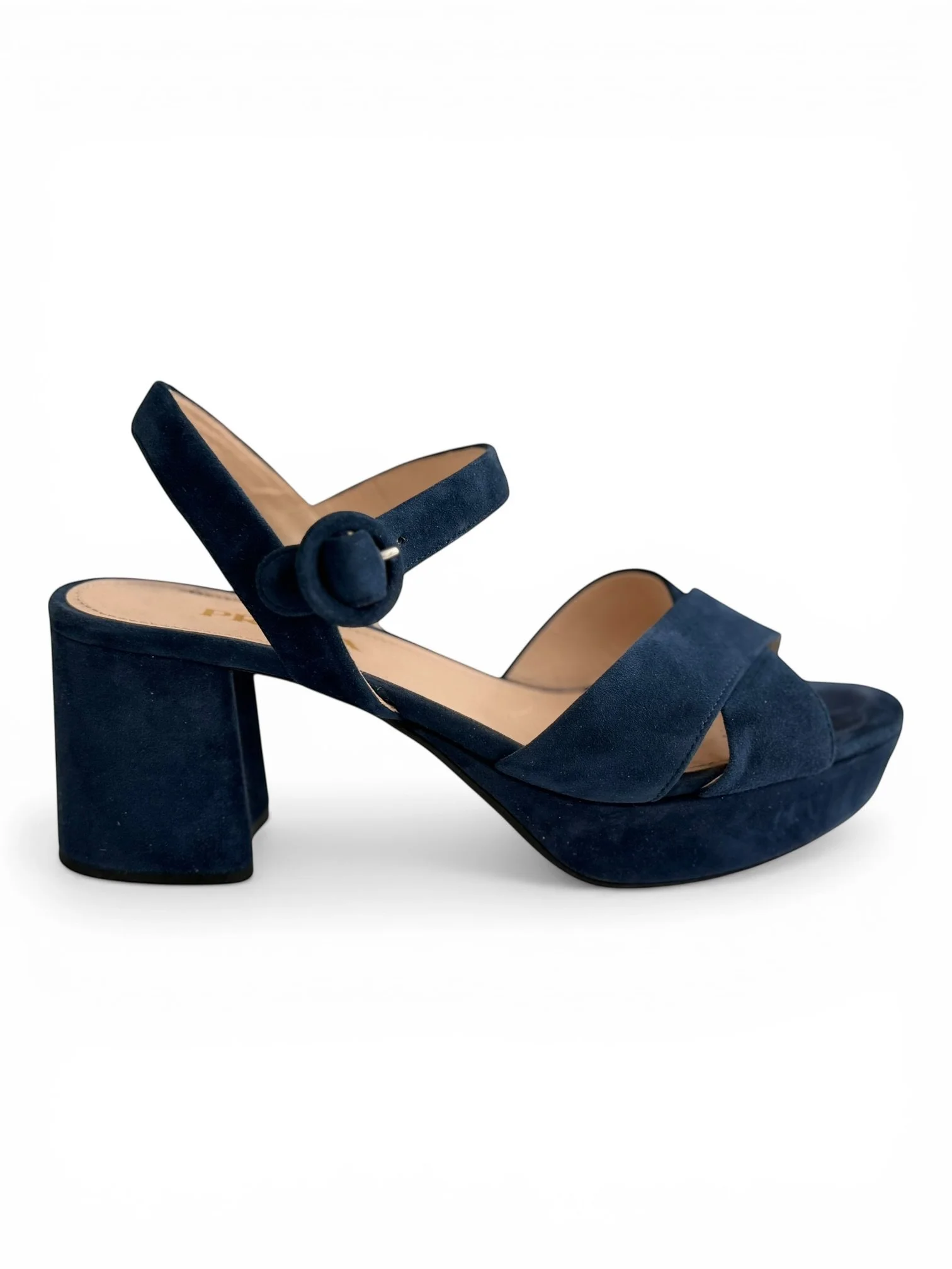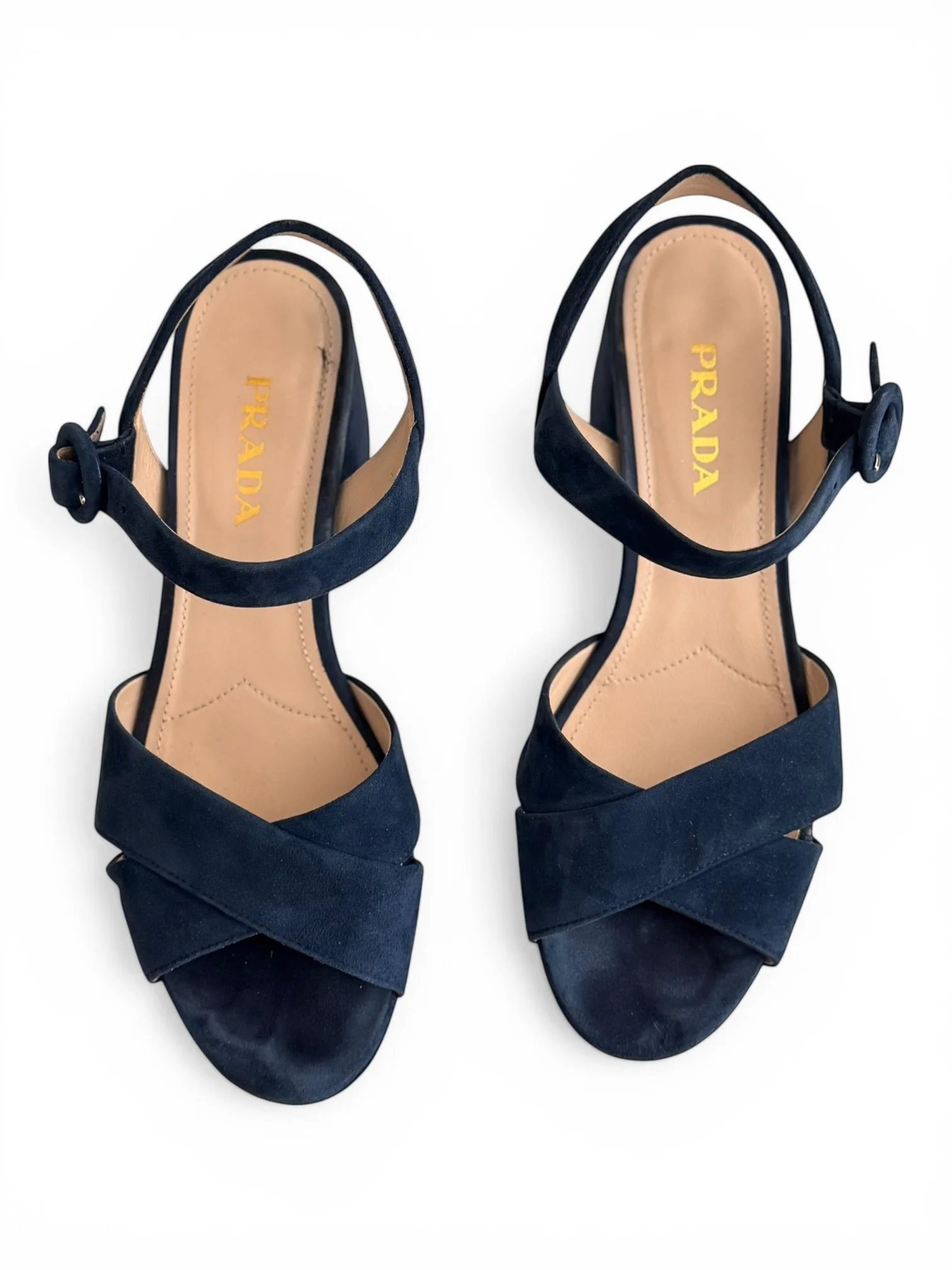 prada suede sandals, navy designer heels, platform sandals women, suede block heel sandals, quiet luxury shoes, minimalist designer heels, ankle strap sandals, wedding guest shoes, coastal chic style, luxury footwear, womens designer heels, prada shoes women, platform block heels, crossover strap sandals, designer resale